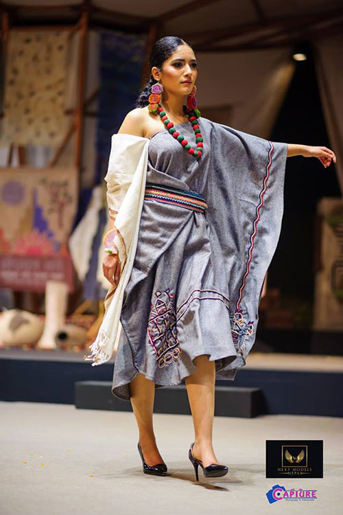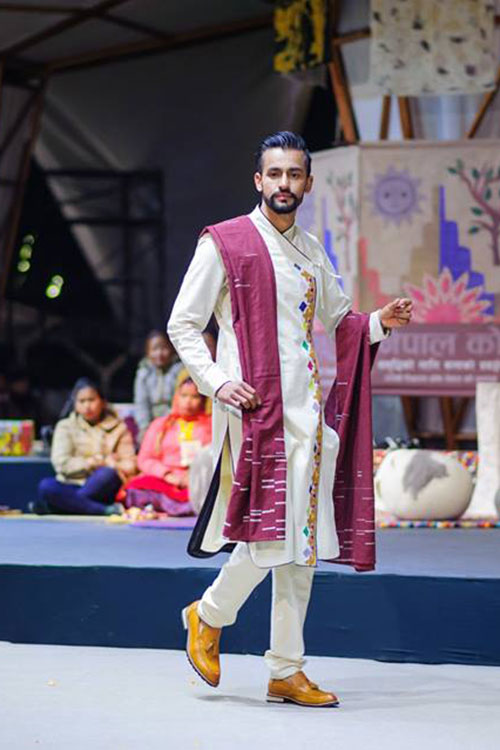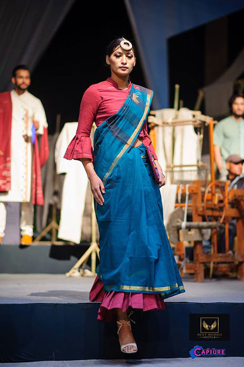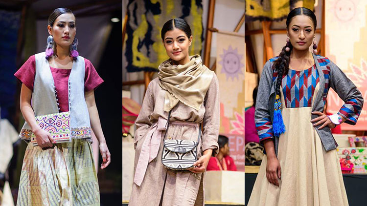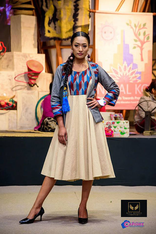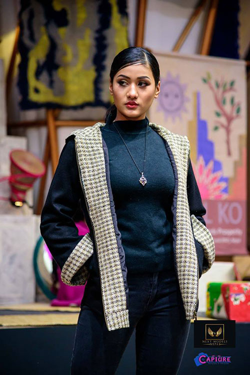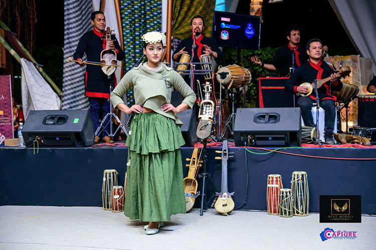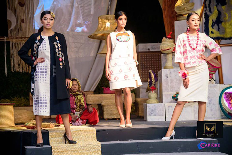 By Rojin Shakya, A fashion show with a difference, other than the regular style of showcasing a fashion show, the presentation saw something fresh. The models walked through a curvy runway while on the backdrop the fusion band called Kutumba was seen playing Nepali tunes and side by side the weaving scene of fabrics was seen on January 12th 2018.