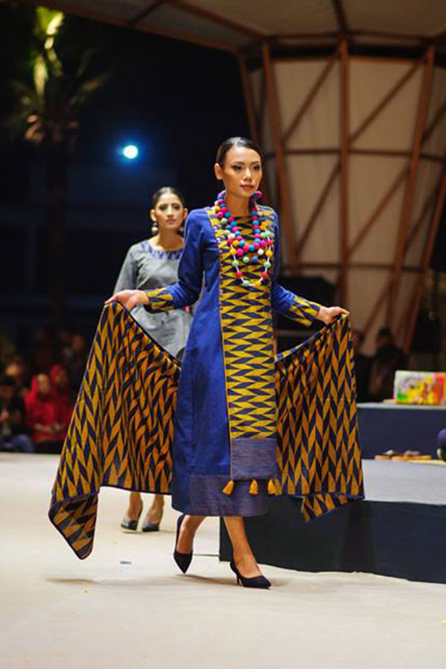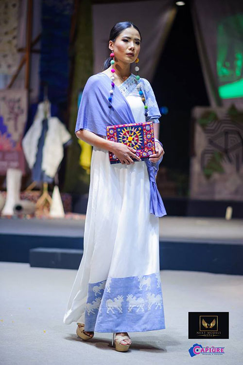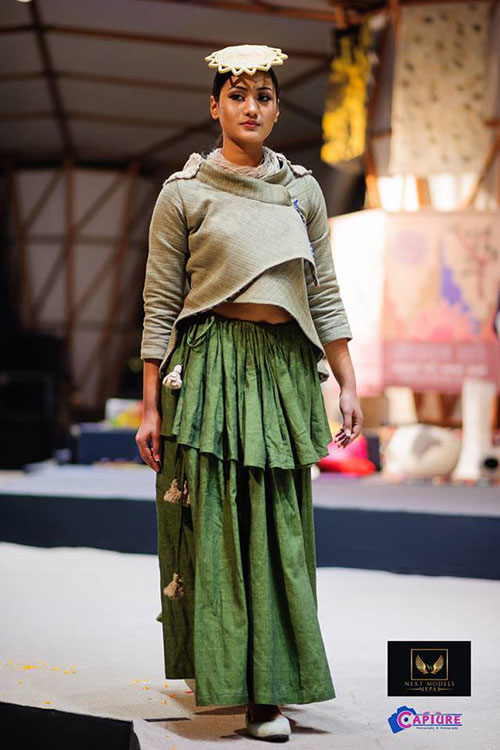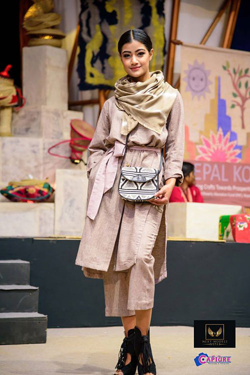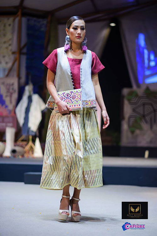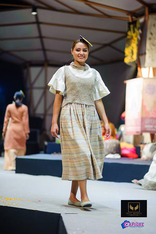 The various handicraft products were displayed behind the runway to create mood of the craft show. Fourteen female and two male models displayed various attires made out of hand made textiles and natural fibers. The formals, semi formals and casuals were seen performed by the models.