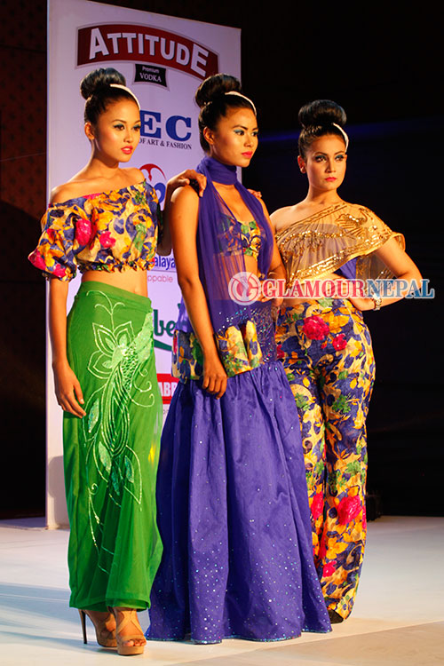 The show saw 12 number of sequences through which the graduating students showcased their immense talent and creativity in exploring innovation in fashion and style. The show took off with the theme named the coral bliss which had creations by Priti Shrestha and Pratichhya Bakhati who explored their talent in Mermaid and A line silhouettes. Likewise designer duo Riplobon Rai & Meena Prajapati work was seen in fusion theme which showcased the attires being inspired by Rai and Newar culture.