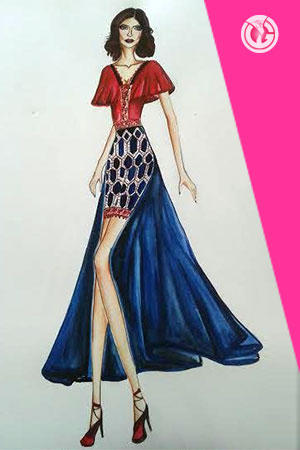 This dress is imagined for the night party of the day of love and is made being based on two major colors, red and blue. The fabrics suggested for the dress are chiffon, stretchy fabric and Velvet. According to design the whole silhouette is created thinking the pear shape body figure.