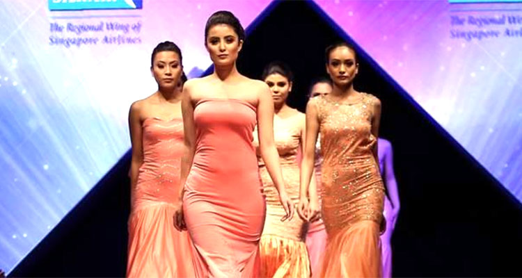 The knee length and mid thigh length dresses came through the runway with lots of stone embellishments. This collection was presented by Ila Shakya, Urjana Shrestha and Geeta Deupala which was majorly based on the color blue. The pastel colors got the life with the collection showcased by Anita Chhetri, Caroline Rai and Jamuna Maharjan. Their collection long and fish tail gowns with glitters and shines.