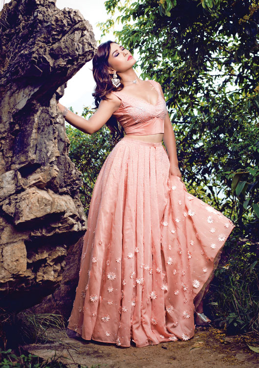 Two piece lengha gown in peach with 3D floral applique by MANISH RAI, Earrings: M.P. Collection Accessories: Mala’s own.