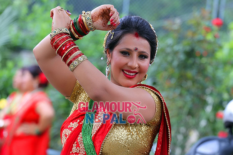 Modern Folk song singer as well as MC (Program Host) Manju Poudel looks gorgeous in teej Looks. all images by Kamal Shrestha / Glamour Nepal