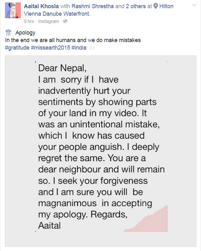 Miss Earth India Aaital Khosla Says I am Sorry To Nepal