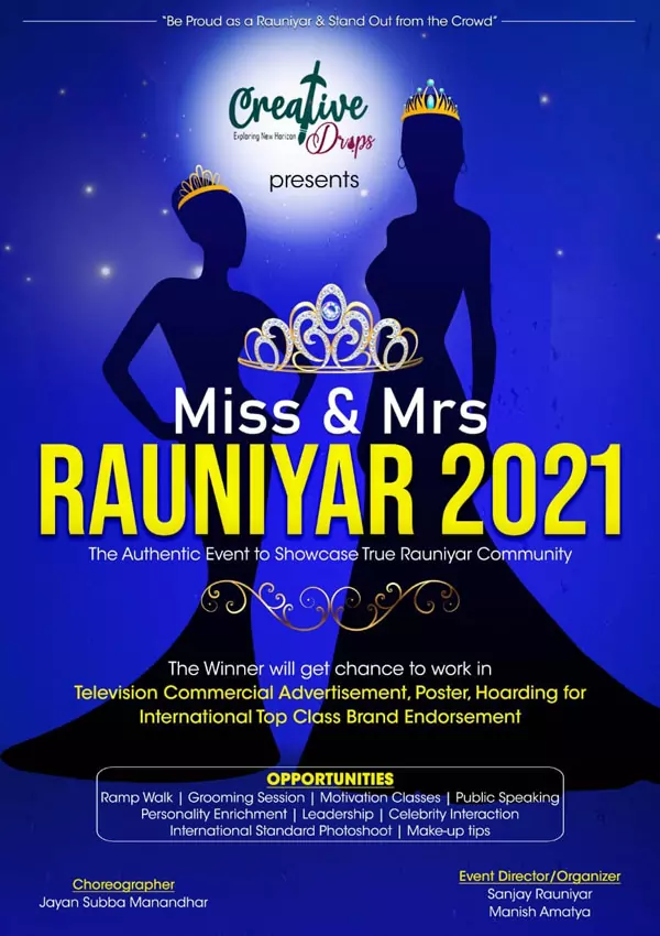 The event also aims to contribute to the promotion and preservation of art, culture, customs, and tradition of the Rauniyar community. The event is being organized under the banner of Creative Drops while Ace fashion and glamour photographer, as well as ad filmmaker Sanjay Rauniyar and Advertising Entrepreneur Manish Amatya, would be looking after the direction and execution of the event. The audition round of the event is scheduled for the first week of the month of Bhadra. The event would be choreographed by fashion choreographer and media person Jayan Subba Manandhar.