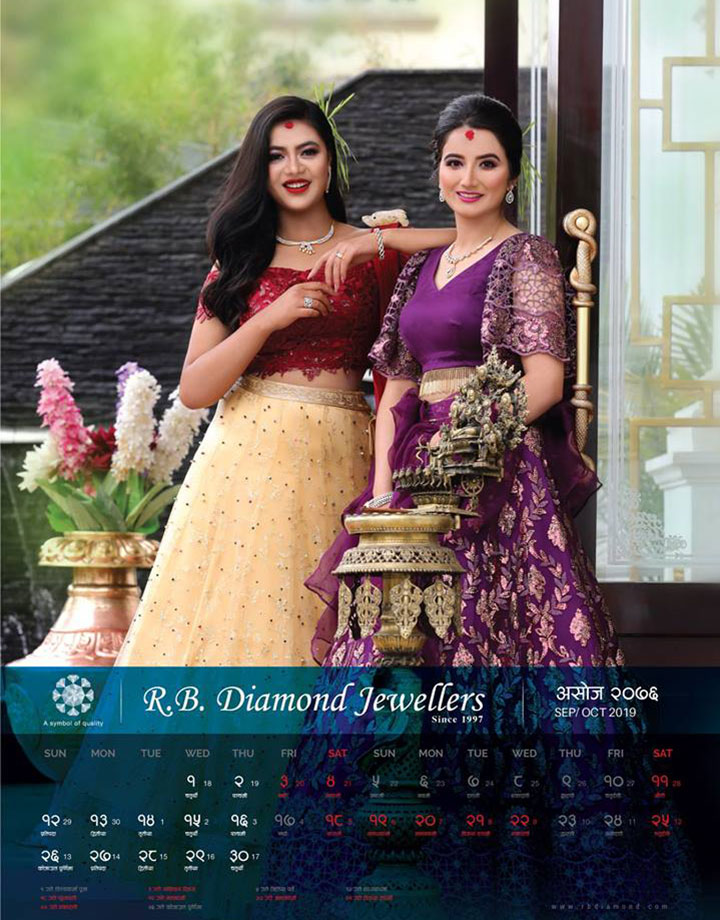 The mood of festival continues in the month of Aswin and Kartik. The page of month of Aswin has beauties Sara Bajimaya and Nancy Bogati wearing festival lehengas from Arshiya Couture.