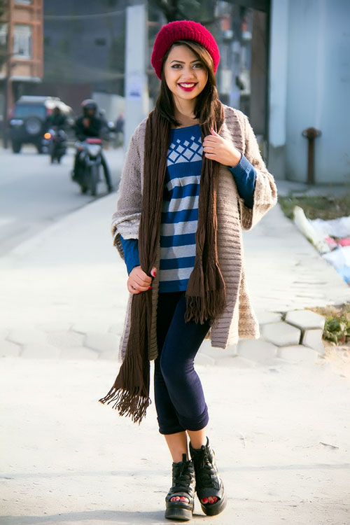 Just because it’s cold doesn’t mean we can’t dress stylishly. The long sweater ensures a bright, fashionable look and a beanie is a must in winter.