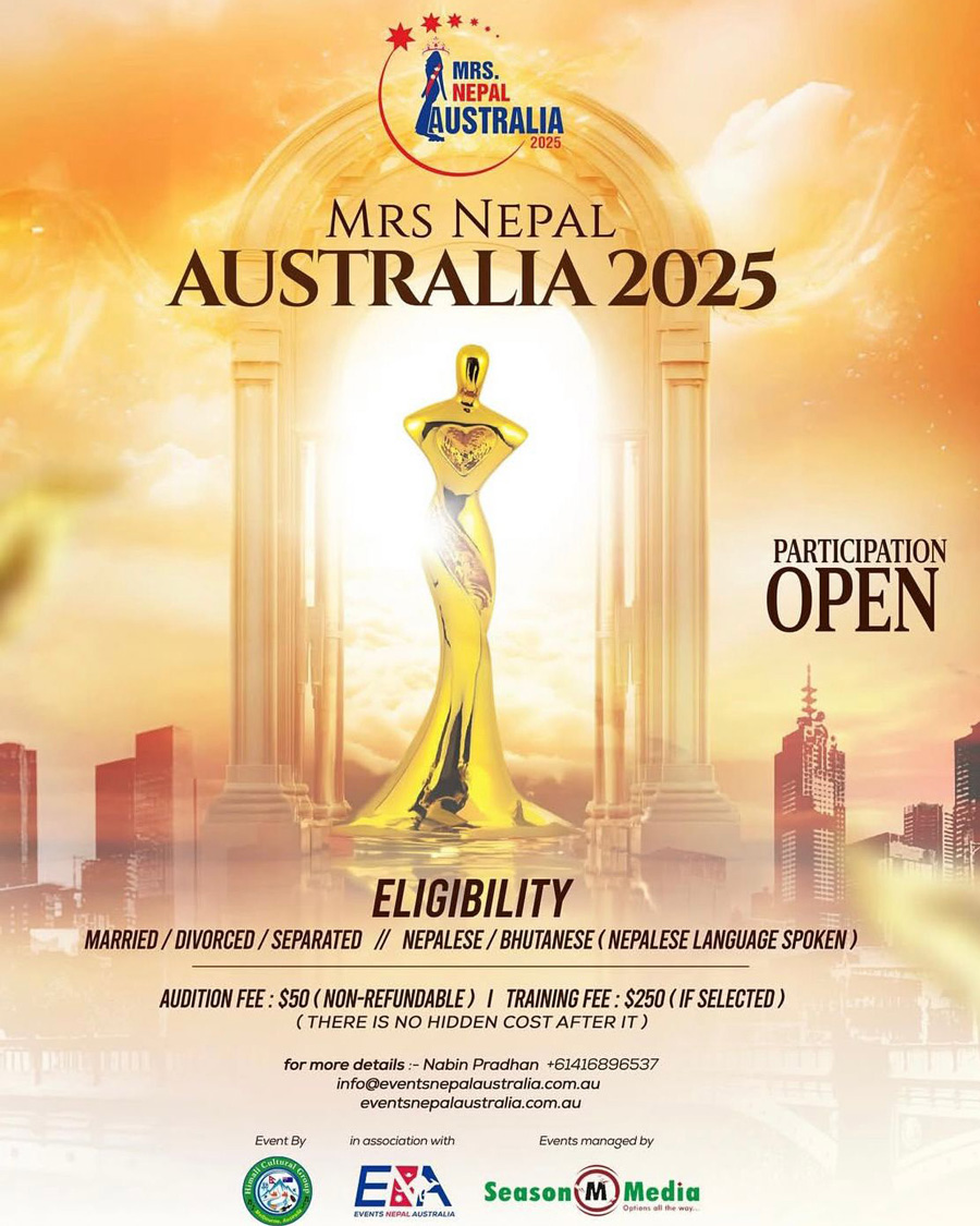 Himali Culture Group Melbourne, in collaboration with Events Nepal Australia, has officially announced the launch of the “Mrs. Nepal Australia” pageant, a competition dedicated to empowering married Nepali women residing in Australia. Applications for participation are now open. This marks the first time Himali Culture Group is hosting such an event, designed specifically for Nepali women who have settled in Australia and are actively engaged in various professions.