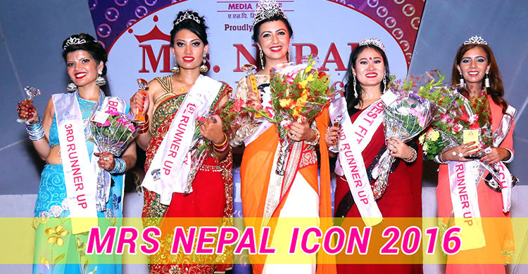 A beauty contest based on married woman MRS NEPAL ICON 2016 has been successfully held in Kathmandu on 6th July 2016. In the event, Mrs Anu Sharma won the main title and announced as New Mrs Nepal Icon 2016. while Mrs Trishna Pradhan, Mrs Sandhya Thapa, Saraswoti Shahani and Mrs Muna Paudel declared as 1st, 2nd 3rd and 4th Runner ups respectively.
