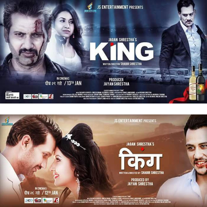 Posters of Nepali Movie King, Starring Nikhil Upreti, Anoop Bikram Sahi and Benisha Hamal. Directed by Shabir Shrestha and Produced by Jayan Shrestha. Releasing all over Nepal on 12th Jan 2017 (2073 Poush 28).