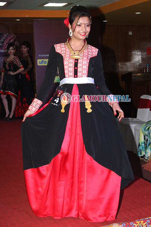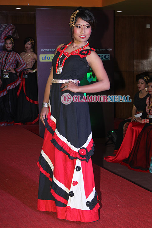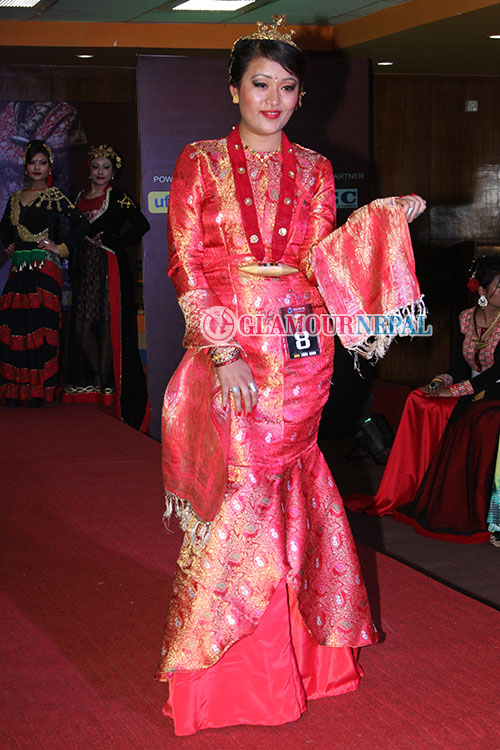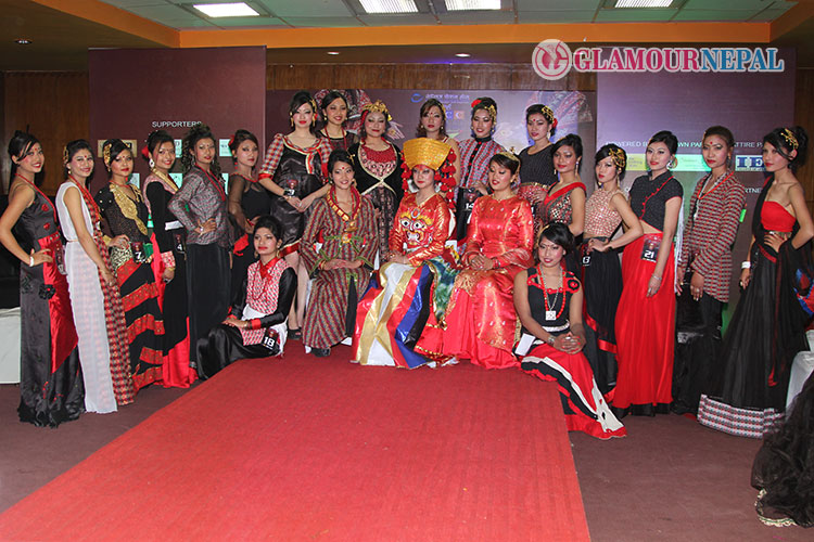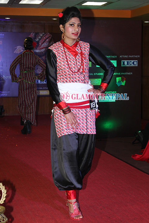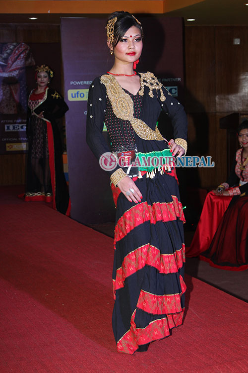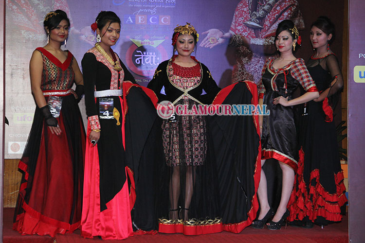 19th of February 2016 marked a competition for the contestants of Miss Newa 1136 called Attire show. This was a sub competition for the title award Miss Best Attire. During the runway performance Twenty two contestants of 11th season of Miss Newa Pageant performed in various attires inspired by Newar culture, tradition, art and craftsmanship. Almost all the attires had Haku patasi and Nepali Dhaka in common. The attires flaunted by the contestants were modernized or fusion version of traditional dresses of Newar community. The jewelry, styling and overall look was also based influenced from Newar culture.