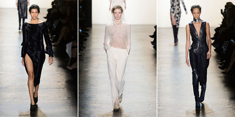 The knee-length dresses with long sleeves and high necks with slits, slashes up at the thigh or around the shoulders were the highlights of the collection which gave clothing an edge and sexiness.