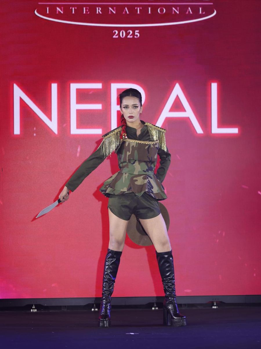 At the international competition, Prapti stunned in breathtaking designs by Sonam Subba Limbu, blending Nepali traditional artistry with contemporary fashion flair. Each outfit amplified her elegance and storytelling on the global stage.