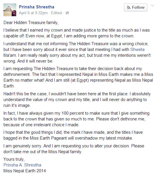 After the decision been made by The Hidden Treasure Pvt. Ltd., organizer of Miss Nepal pageant to dethrone Miss Nepal Earth 2014 Prinsha Shrestha reasoning on the grounds of her inability and failure to uphold the dignity, discipline, decency and decorum of Miss Nepal Earth 2014 title, Prinsha has expressed her apology to The Hidden Treasure for her participation at Miss Eco Queen 2015 which she did not informed about her act related to that.