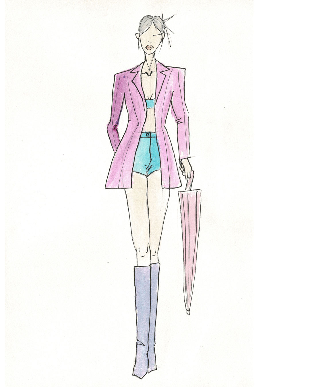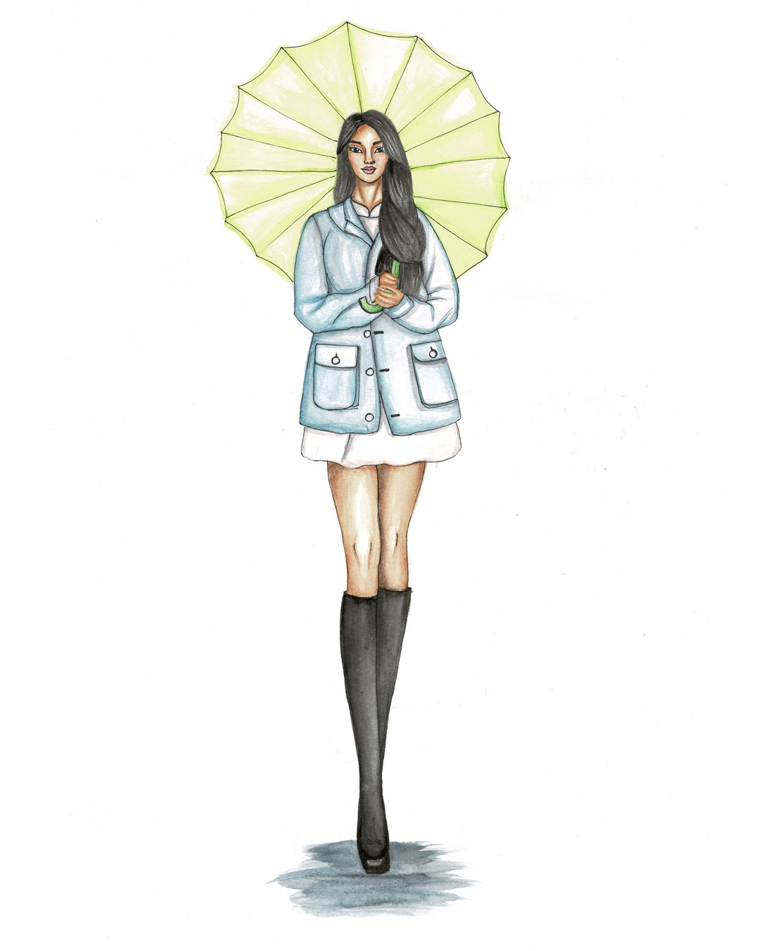 The look is grounded by knee high waterproof boots, ensuring your feet stay completely dry and comfortable, no matter how challenging the puddles. Completing the outfit, the umbrella transcends its functional purpose to become a bold and integral style statement.