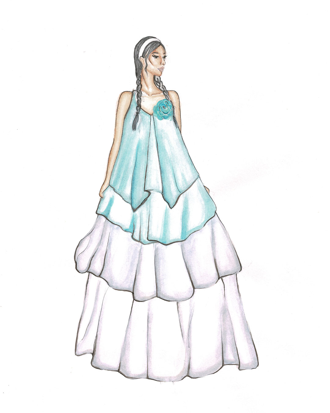 This enchanting, multi tiered gown is an embodiment of the blue lily theme, exuding an aura that is distinctly soft, serene, and utterly ethereal. The dress flows in delicate gradients of powder blue and silvery lavender, masterfully mirroring the subtle, almost magical beauty of a blue lily as it gently unfurls. Its cascading tiers are not merely decorative; they are meticulously designed to evoke the organic movement of lily petals expanding in the soft light of early morning, creating a mesmerizing sense of motion and grace with every step the wearer takes.