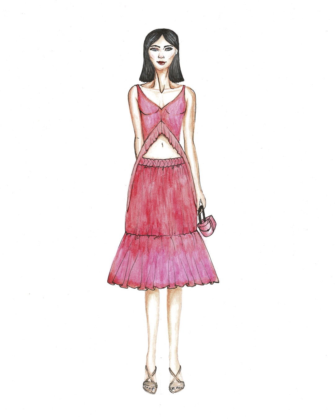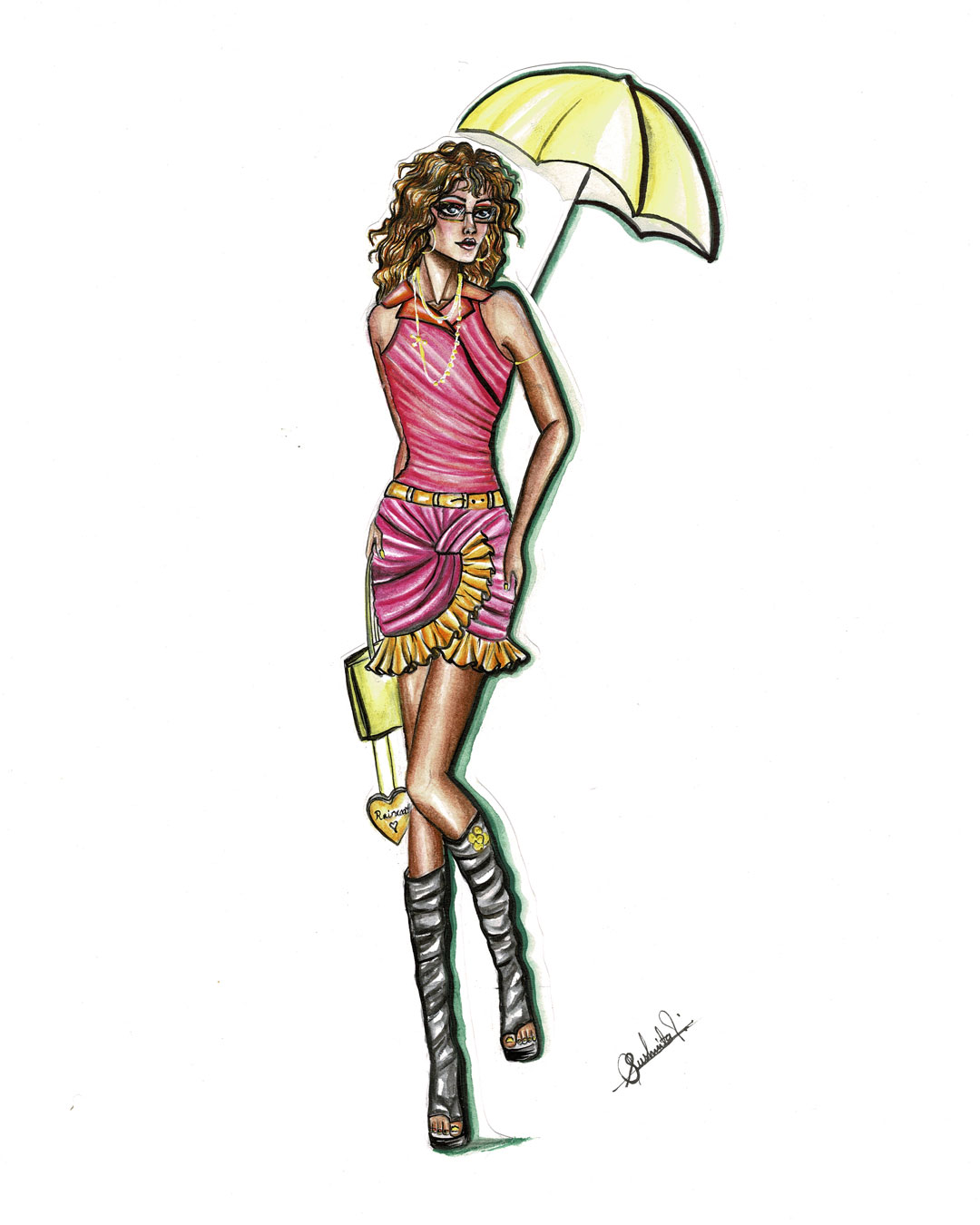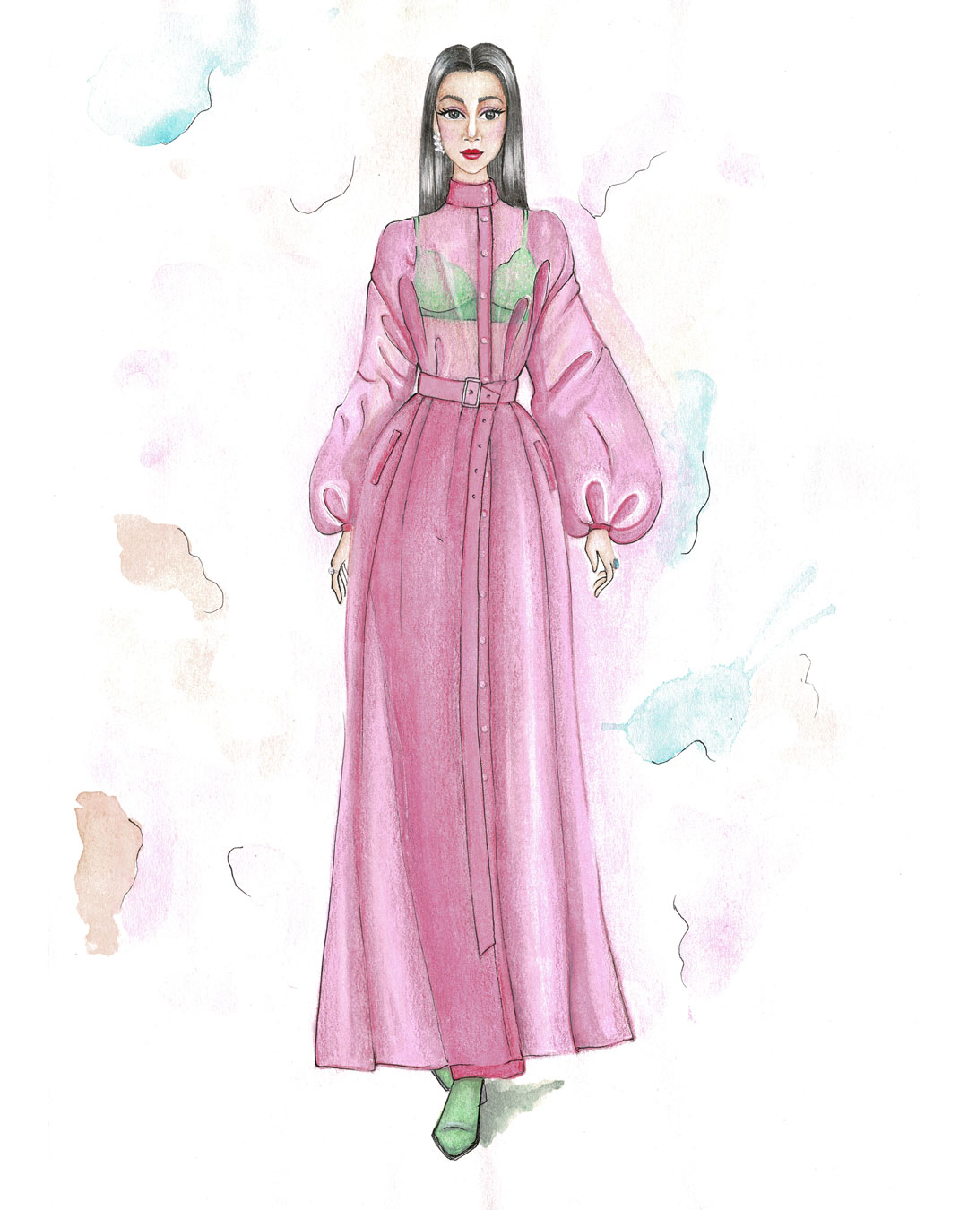 The warm pink base serves as the grounding color, symbolizing calmness and inner strength, while sunny yellow frill detailing and a cinched belt at the waist inject a joyful energy into the overall look reminding us that the rain, too, has beauty in its rhythm.