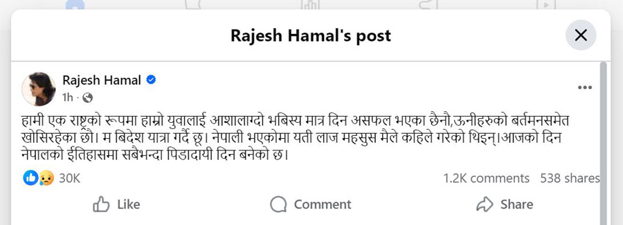 “As a nation, we have not only failed to provide our youth with a hopeful future, but we are also robbing them of their present. I am traveling abroad. Never in my life have I felt such shame in being Nepali. Today has become the most painful day in Nepal’s history.”