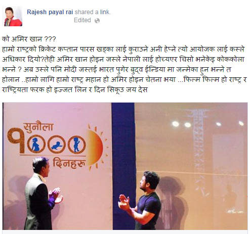 Referring to a news story “Paras neglected with Aamir’s arrival” published in one of the online news portal, Rai took to Facebook expressing his disapproval. “Our nation is great for us, not Aamir.
