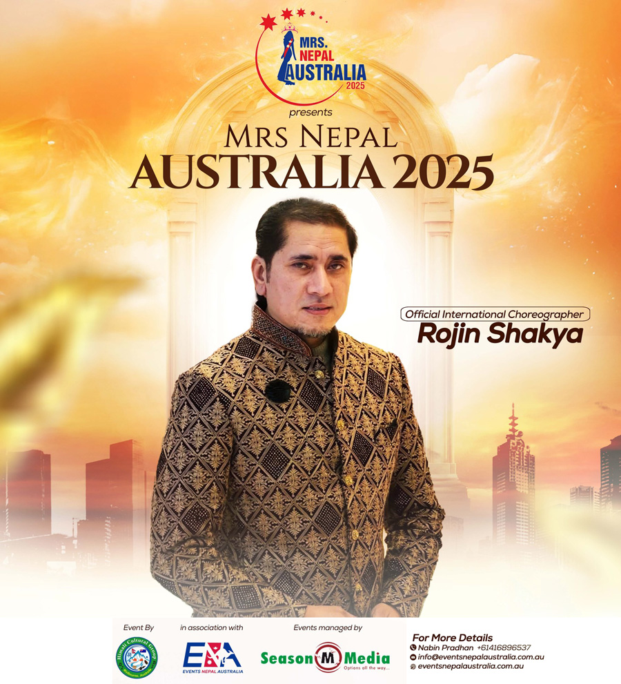 As part of the Mrs. Nepal Australia 2025 pageant journey, Rojin will lead the grooming and choreography of 30 shortlisted contestants. His training will cover stage presence, runway skills, performance coordination, and overall presentation.