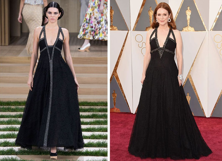 Moore’s lacy black gown was a modified version of one that Kendall Jenner wore on the Chanel runway, removing the encrusted stripe going down the center and pairing it with a wrist cuff and statement earrings. In this case, we prefer Moore’s version! (Photos: Getty Images)