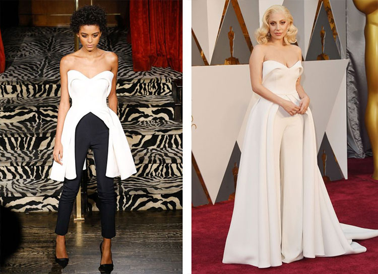 Gaga’s dramatic outfit included a modified version of this strapless Brandon Maxwell top, with a lengthened peplum that became a train of sorts. She paired hers with white trousers for a much more glamorous look than the runway version. (Photos: Getty Images)