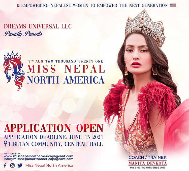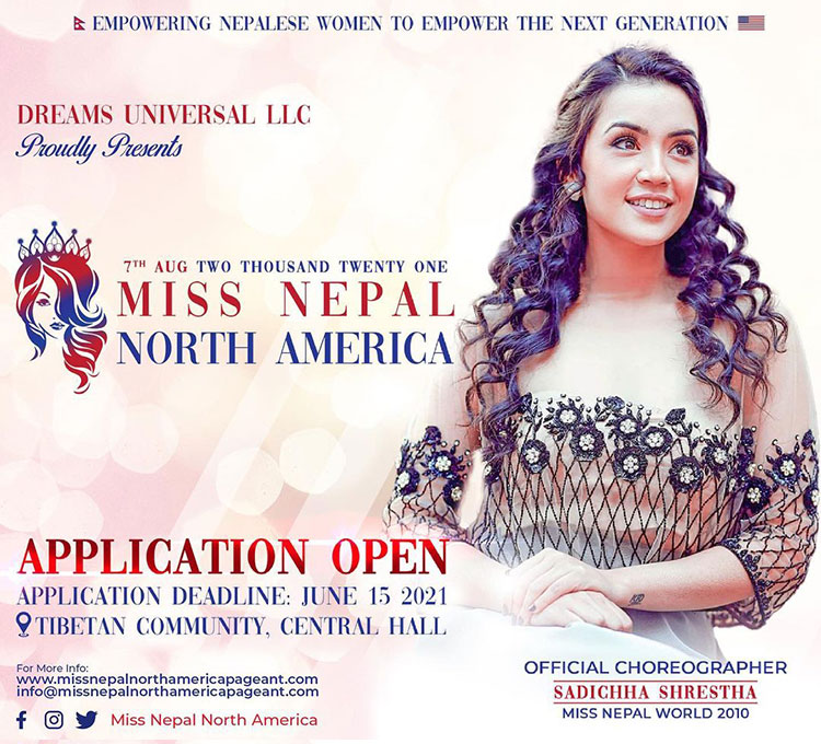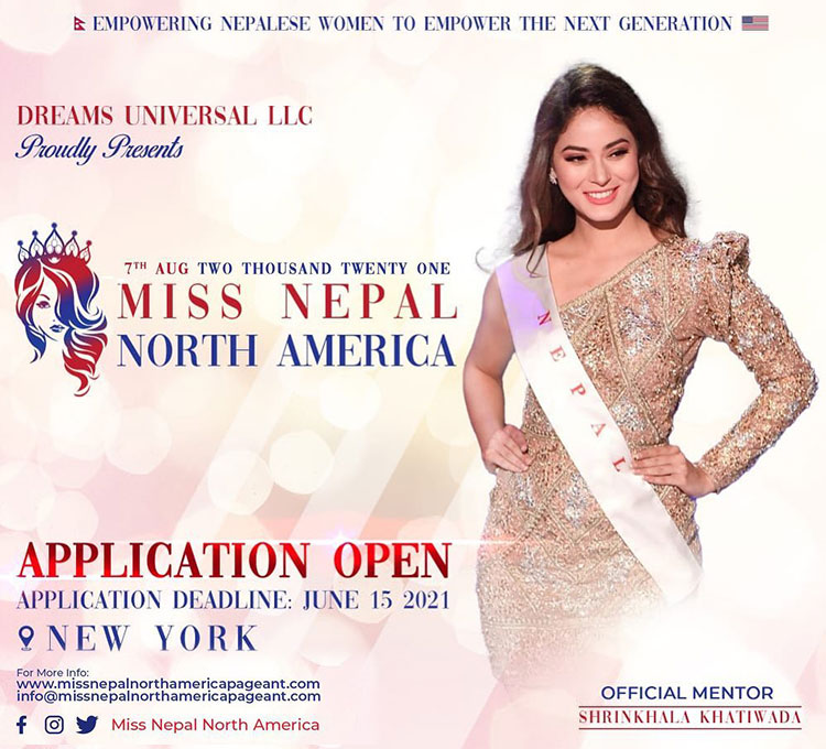 The finale of Miss Nepal North America 2021 is scheduled for 7th August 2021 while the last deadline for the application is June 15, 2021. Earlier Monica Ghale was been crowned as Miss Nepal North America 2018 while Sriya Gajurel was elected as Miss Nepal North America 2019.