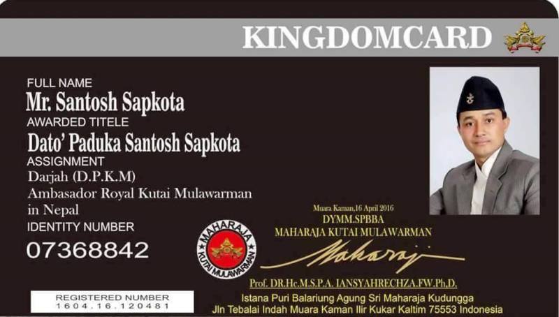 The title conferred to Mr. Sapkota was Dato’ Paduka Santosh Sapkota which honors him as VVIP and has assigned him with the designation as an Ambassador of Royal Kutai Mulawarman in Nepal. Mr. Sapkota was conferred with the title of Dato’ Paduka on 16th April 2016 at National stadium of Indonesia among the thirty thousand mass. Mr. Sapkota was then given a royal treat with VVIP escort honor back to the Palace of the king where he was handed over with the official certificate of Ambassador of Royal Kutai Mulawarman in Nepal.