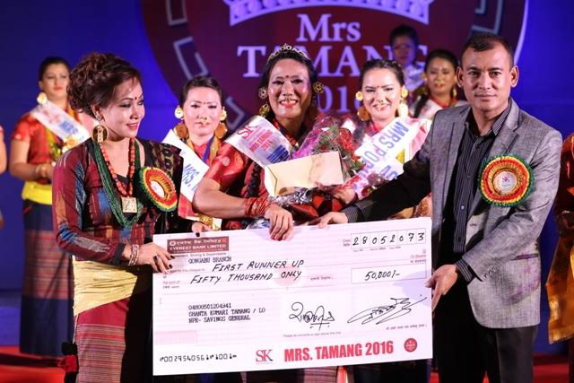 Organized by S.K. Entertainment Pvt. Ltd., premiere edition of the event had seventeen ladies competing for the title awards. In the event Shanti Tamang was successful to put herself as the winner for the event. Along with the tiara of Mrs. Tamang 2016, Shanti rode away the brand new scooty as her winning prize. Besides winning award, Shanti was also awarded with sub awards called Mrs. Face book and Mrs. Popular.