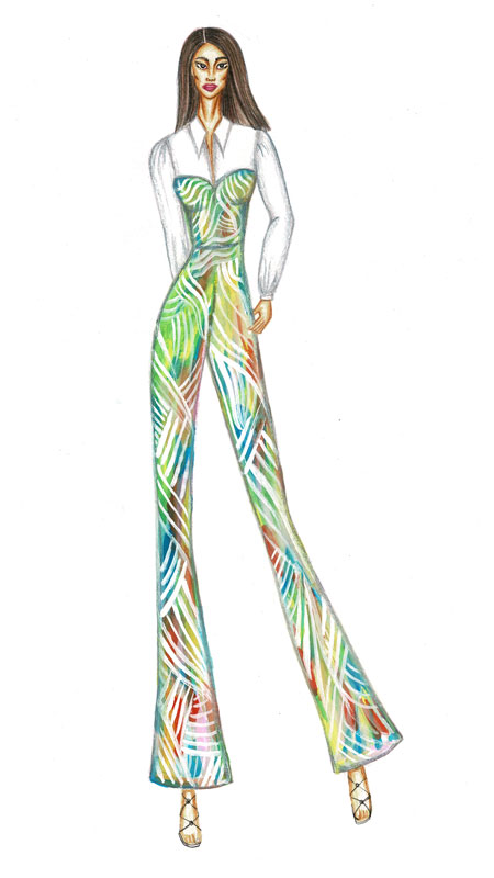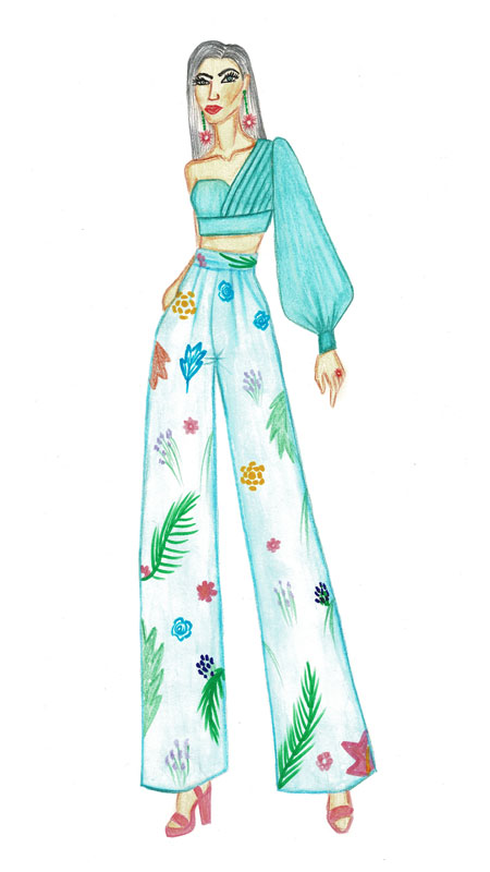The design is inspired by an “Abstract Art”. The design does not attempt to represent an accurate depiction of a visual reality but uses shapes, colors, forms, and gestural marks to achieve its effect. The design encourages involvement and imagination. The main objective of design is to provide viewers with an emotional experience with bright summer colors. The design gives an abstract vibe only choosing summer colors i.e., yellow, turquoise, purple, light green, white and pink. The design is white satin shirt followed by a corset in an abstract print and wide flared cotton pants in the same pattern. The design embellishes the wearer’s waistline with the help of corset and wide flared pant gives all the summer vibes. The design is suitable for teenage girls who decide to look chic and elegant at the same time. Minimal make-up is suggested prioritizing bright pink lips. Also, the accessories are to be kept minimal as the attire is already in bright colors. The hairstyle could be ponytail to give all that summer look.