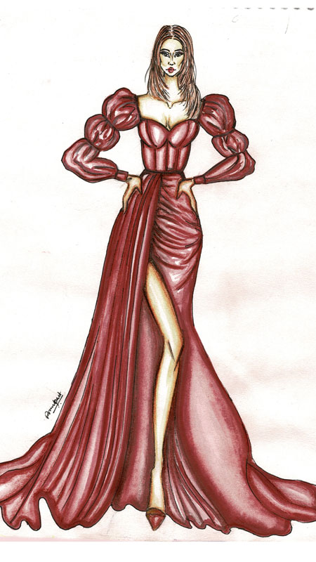 This is a summer evening party gown. The fabric suggested for the dress is cotton silk. The Colour selected is maroon red as it is the major color to represent party vibes. The dress is a full floor-length having slit on the right leg till the lower thigh. It is a drapery with fitted sweetheart top having series break puff with cuff at wrist with defined waist. It is suggested for the ladies in their early 20s for all types of complexion, tall figured and having hour glass figure shape. The back side of the dress is simple than the frontal part. The shoes suggested for the wearer of this dress is a pair of closed toe high heels. To shine like a celebrity, the best way to get the job done with the dress is keeping eye makeup simple and warm keeping the Smokey eye would do all. The makeup should be super neutral with just a swipe of mascara and a dash of concealer. Keeping the skin glossy, one can add some blusher on the cheeks and finish the look with highlighter by applying reflective makeup to all the right places, with this all, the wearer would simply shine as a gorgeous.