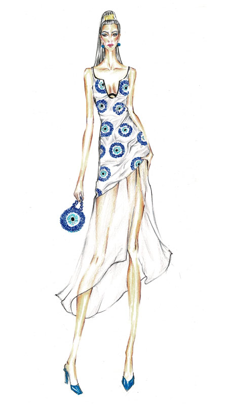 The material that can be used for the design are white Japanese silk, crepe, chiffon and for the embroidery the symbol evil eye is embellished with beads (Persian blue, white and sky blue). The silhouette is bodycon with flowy attached skirt. Besides, the dress has a plunging neck design with zipper at the right side for comfort and fitting. To make it look more lavishing, it’s better to be paired up with round shape bag and matching heels. A fine ponytail hairstyle would give the wearer more powerful look.