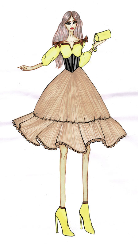 This is a summer dress which have vintage touch and is suggested for gatherings like baby shower, birthdays and for the events like fashion show and product launch. The fabric suggested for is cotton, for under bust corset soft denim is suggested and for the skirt tulle net is suggested. Colour selected for this dress is shades of yellow as it is the colour that gives summer vibes and shades of brown as it compliments yellow colour perfectly. Lastly for corset black colour is selected to complete the look. The dress is imagined to knee length.