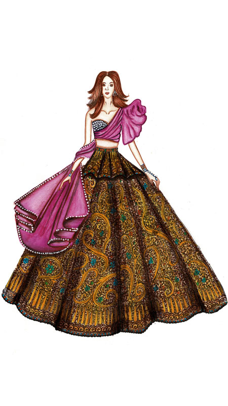 It is an outfit inspired by Indo western fashion. The top of the dress is made strapless and shawl is attached with the top giving the blouse one shoulder top silhouette. The shawl is gathered in the shoulder creating flower like structure. The paneled lehenga compliments the blouse perfectly. This outfit is suggested for the tall figured lady on her 20’s having triangular figure shaped body. The backside of the dress is similar to the frontal part.