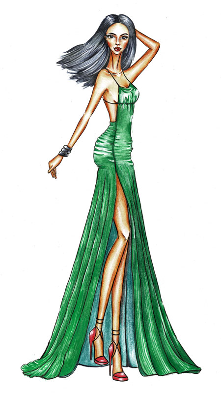 The elegant draped concept is inspired by ancient Greek. The off-shoulder, one-sided sleeve and asymmetrical draped design would give the glamorous look while bell sleeve and flare effect provide the wearer summer vibes. The dress is recommended for the tall figured lady standing five feet six inches and would be suitable for the 18 to 40 age categories. The make-up suggested for this dress is nude make-up that look effortless, stylish and chic. The nude eye shadow applied with coats of mascara and matte nude lipstick balance the looks. This dress would go well with the silver-green high heel, emerald green earring and emerald green rings.