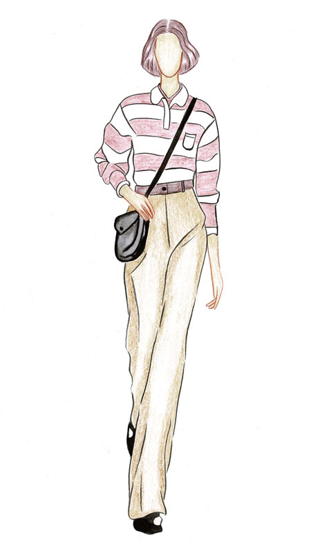 This design was an inspiration and imagination of how someone who loves to be comfortable and is kind of a tomboy would put together an outfit. So, is styled with a cotton polo tee with vertical strips which is obviously men’s tee for sure. The bottom wear is to pair with a baggy cotton and linen mix pant tucked in with a brown belt to show some curves. It’s a trend to carry a small bag, so a black side bag with a front pocket and a space for a phone and basic things to fit it for a comfort and off course a matching black shoe is suggested in this look. For the overall looks bob cut is the perfect hairstyle which also gives a touch of the 90’s vibes.
