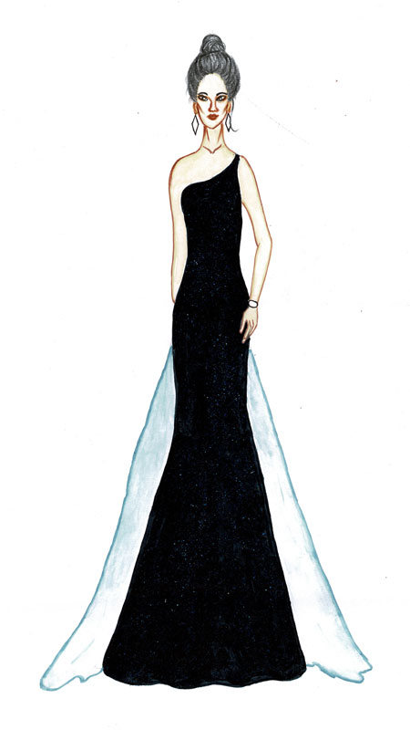 The design of dress is inspired from night sky that appears in a beautiful starry sky colour with shine of stars and a light of moon representing beauty and hope at the same time.The dress is made from shiny chiffon fabric is imagined to the full length adding extra organza from side of mid-thigh to make the wearer look more attractive. The bodycon dark coloured dress having one shoulder neckline is kept simple yet elegant highlighting the beauty bone with matching long triangle shaped earrings. Side zipper is kept for fastening. For the enhancement of the look messy up-do hairstyle fits perfectly along with neutral glam make up look with some sparkle in eyes along with eyeliner and long lashes with matching shade of lipstick. White pair of heels would be adding the confidence to the wearer. The dress is suggested for the ladies of age group of 20-28 years with fair complexion who stands five feet four inches tall.
