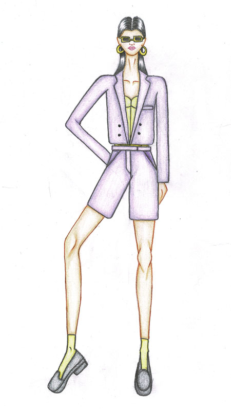 The costume is designed for a woman in her twenties who aspires to conquer the world while also looking stylish. The gorgeous summer flower Jacaranda is the main inspiration for this semi-formal corporate appearance. That’s why the suit’s colour is similar to that of a Jacaranda. The garments silhouette is striking and androgynous. It would be ideal for business meetings and formal occasions. The suit is constructed of cotton, while the corset worn below is made of cotton twill in a lemon-yellow colour that also evokes summer the waist-length coat has plain sleeves with a double breast as well as a hip-length corset tucked into the mid-thigh length high-waisted shorts with cross pocket. The entire appearance focuses on how to appear taller but also flaunt off those stunning legs. Accessorise with enormous golden hoop earrings, lemon-yellow ankle-length socks, black loafers, a little black suede side purse, and a pair of trendy rectangular lemon yellow framed black sunglasses are recommended to complement the ensemble. Soft and fresh glossy pink toned makeup, sleep straight hair tucked behind the ears would create a beautiful clean and polished look.