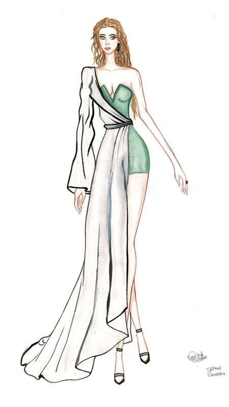 The elegant bodycon dress is draped by another fabric to give asymmetrical looks, perfect for events like: – award function, fashion show, product launch and other parties. The fabric suggested for draped bodycon dress is high quality cotton blend, cool, skin friendly and breathable which offers soft and comfortable feeling. The colour selected is silver-Green for the inner part and white colour for outer part. The bodycon dress is imagined to the thigh length and the draped part is imagined to the floor length.