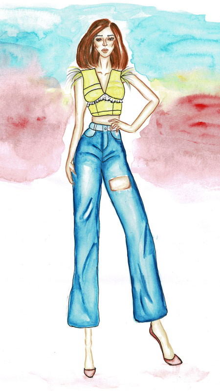 This two-piece dress is inspired from day-to-day look. The look for the day is its reflection. This look is styled with comfort and fashion. For the upper bodice, it includes a V- shaped neckline yellow crop top fitting on the waist line, with white ruffles added on the bust line and fur added on the side shoulder would enhance the look. For the lower body, a high waisted wide denim straight ankle length jean with grunge on the thigh with flats /heels are suggested, which would add extra look to the wearer. As its summer, cotton fabric is suggested. This look would be suitable for every medium weight ladies of age group from twenties with any complexion . To complete the look, little regular makeup is suggested with open hair.