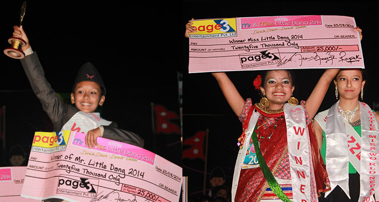 Among the contestants with the best performances Sugam Shah and Melisha Khadka won the title awards of Mr. and Miss Little Dang 2014 respectively. Likewise Paras B.K. and Swastima Kandel were chosen as the first runner-ups whereas Pravin Rawat and Barsha Lamsal were declared as the second runner-ups.