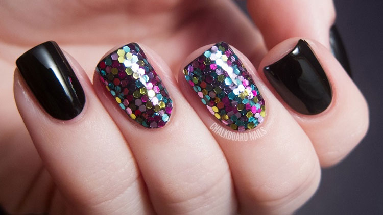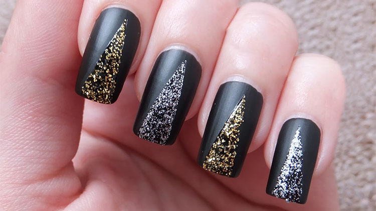 This nail look is an amazing combination of matte and glitter. You can use a black matte nail polish or any other color you like. Add one or more coats if you need to and then think about how you want your glitter to be. You can choose spike like on the picture, or some other shape. Cutting a paper in that shape and placing it on top of our nails can save us time from correcting mistakes.
