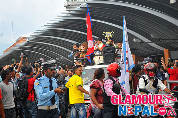 Teriya Magar, winner of an Indian television dance reality Show ‘Dance India Dance (DID) Little Masters’ season 3, arrived in Kathmandu on Saturday 28th June 2014. A huge crowd of her relatives, well-wishers and Fans welcomed her as she arrived at Tribhuvan International Airport along with her mother carrying the winner’s trophy.